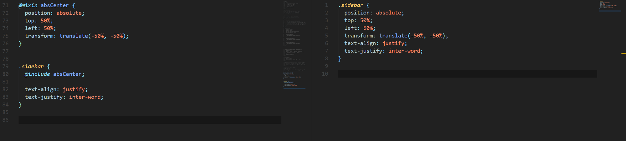 在左侧,我们有 mixin absCenter,使用 @include 将它包含在 .sidebar 选择器中。生成的 CSS 中就会自动包括 Mixin 的代码段了。